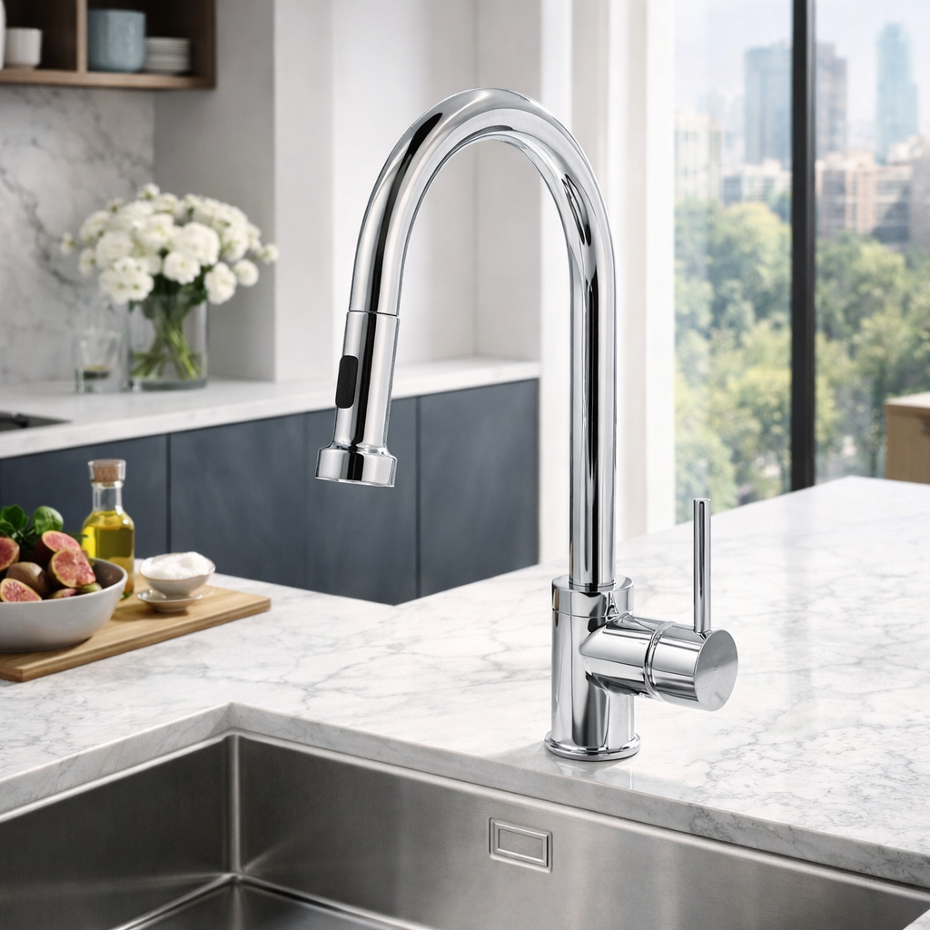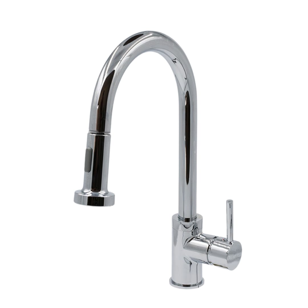 Mezcladora de cocina extraible, pico movil, terminación cromo. Altura 41 cm, largo de pico 24 cm. Marca Zhen, industria china , clase A.