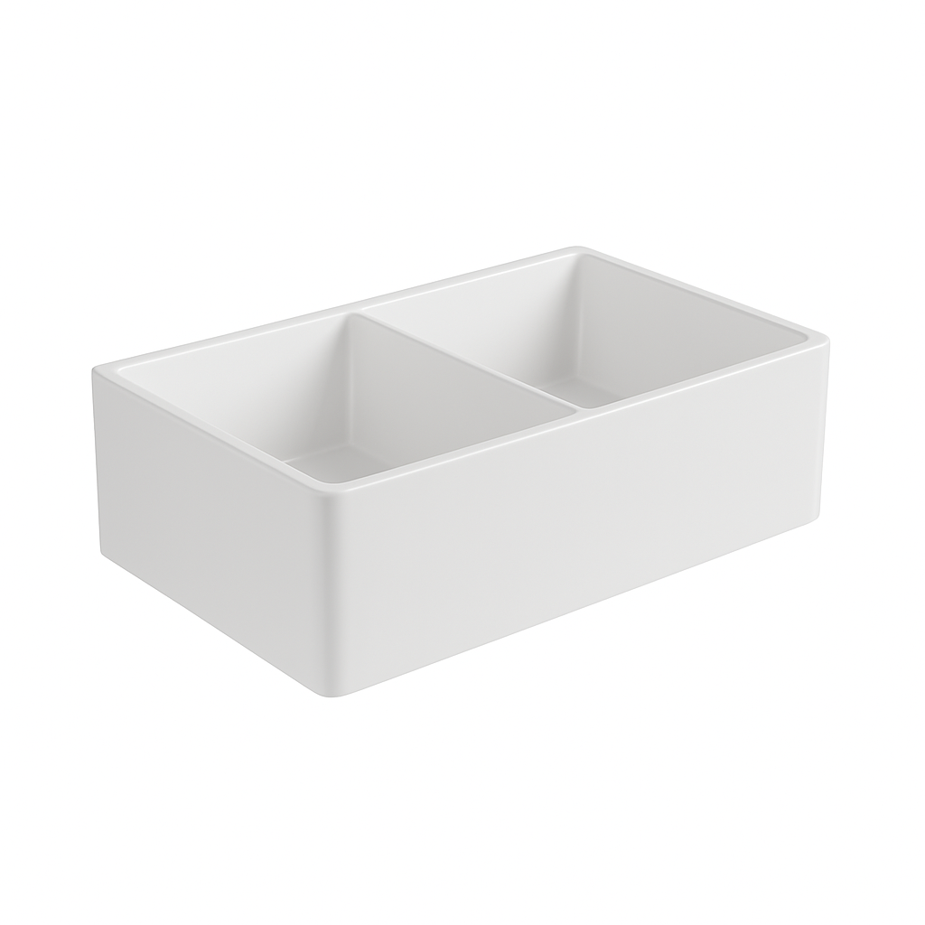 Bacha de cocina con faldón blanca. Material cerámica, medidas 84 cm x 46 cm x 25.5 cm. No incluye sifon y sopapa. Marca Zhen, industria china clase A.