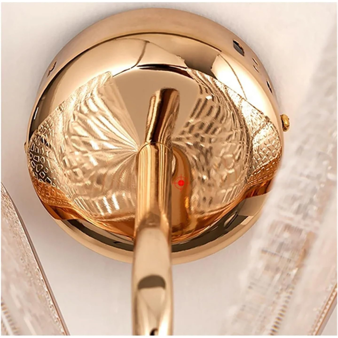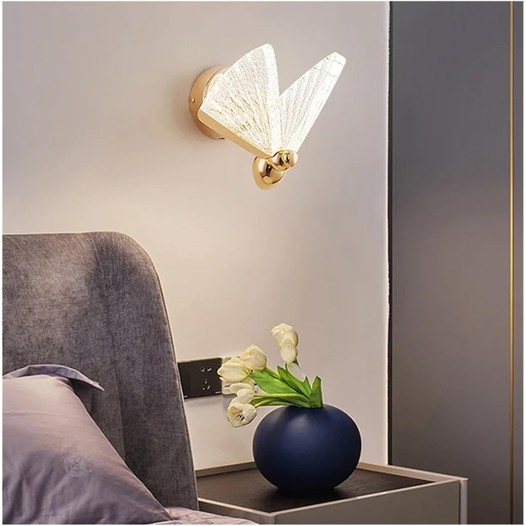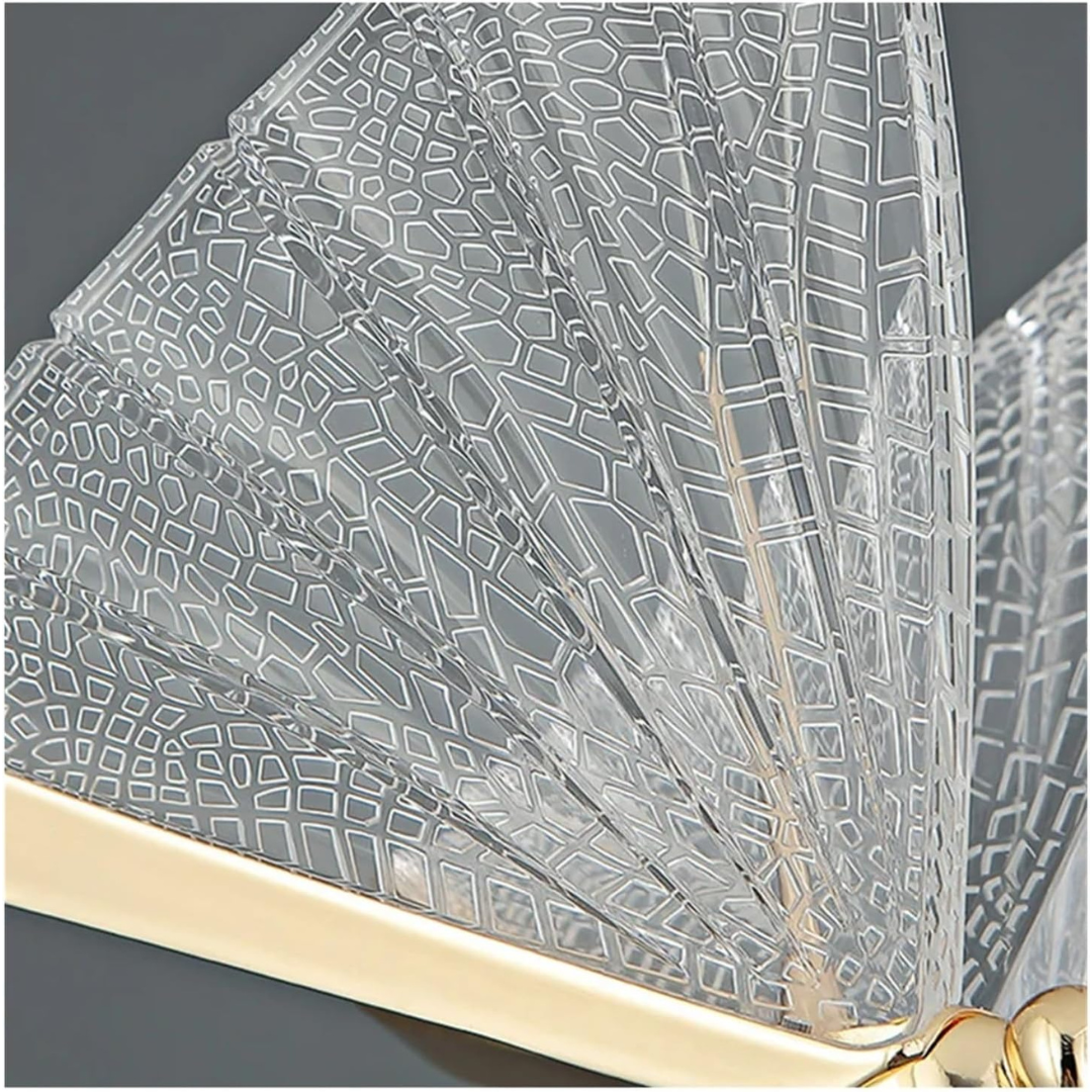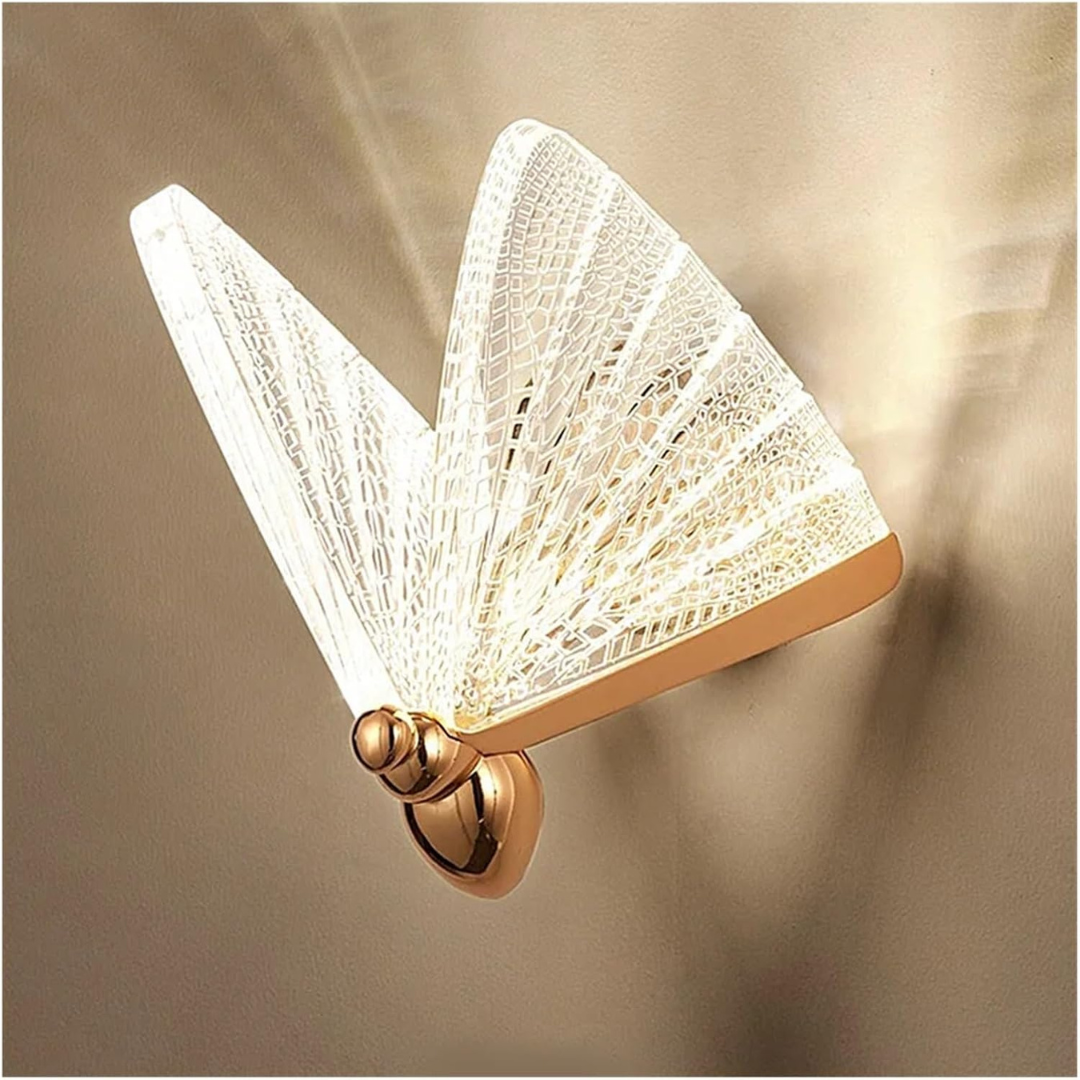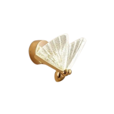 Aplique adosado a pared con diseño de mariposa en acrílico, en acabado dorado. Medidas 25 cm x 20 cm. Marca Zhen, industria China clase A.