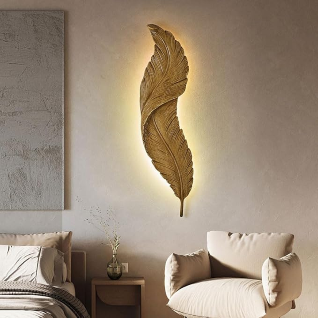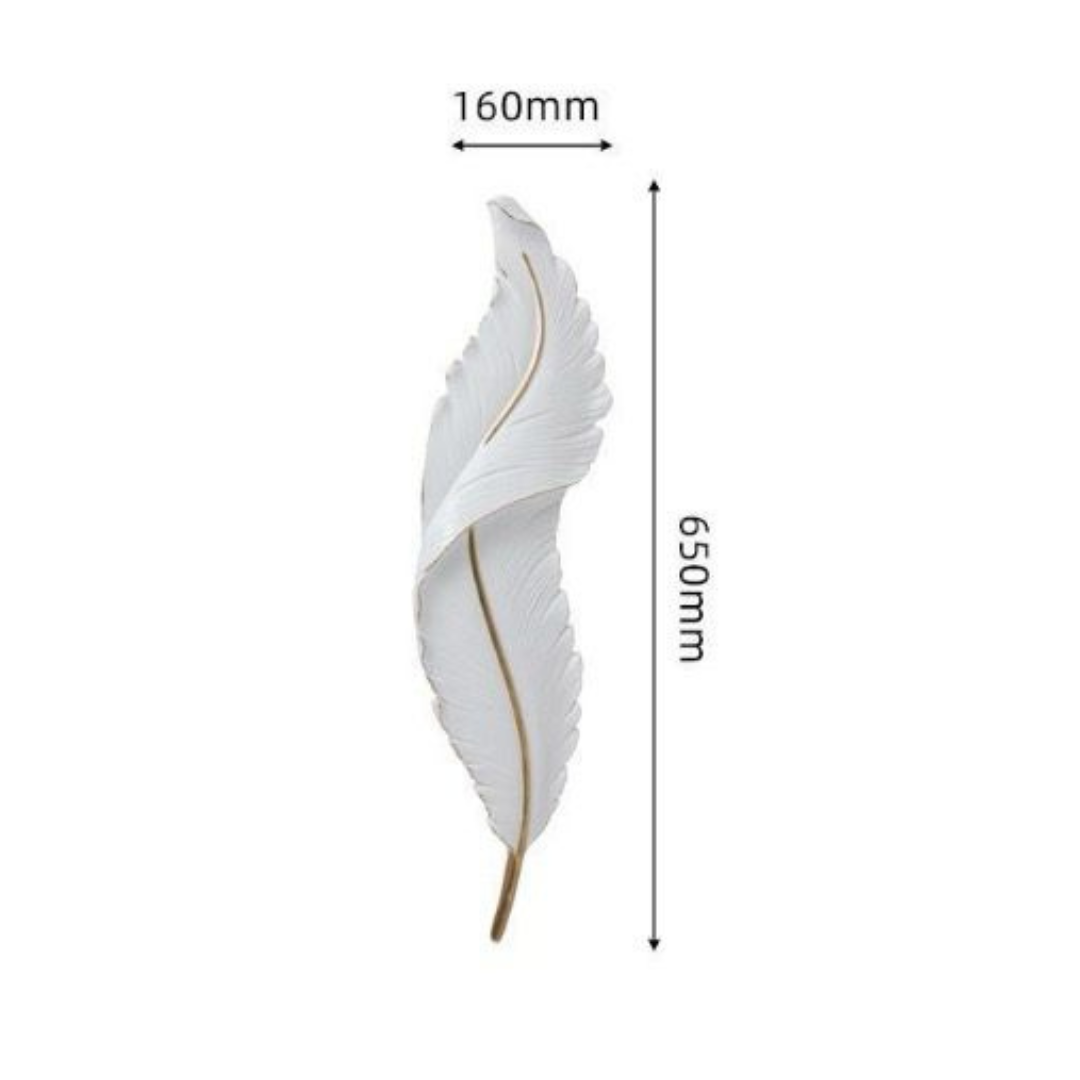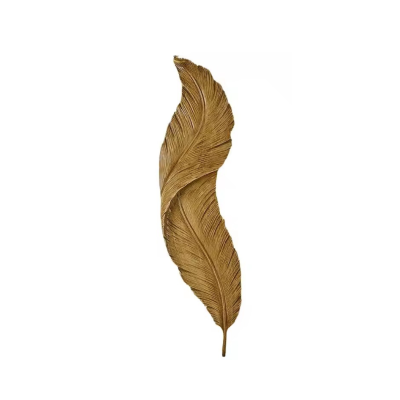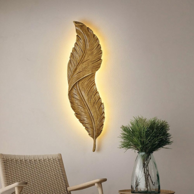 Aplique led en ceramica con diseño de pluma acabado dorado cepillado, de largo 65 cm. Luz calida.