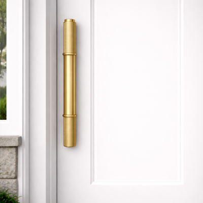 Par de manijones en acero inoxidable de 60 cm de largo y 5.1 cm de diametro, con detalles de diseño en las puntas, en acabado oro cepillado. Marca Helios, industria americana.