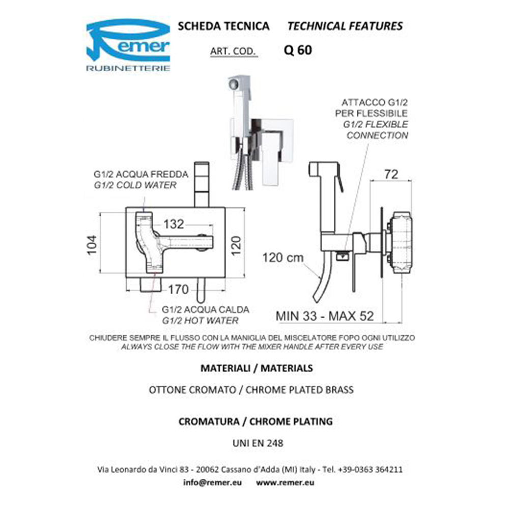 Ducha higienica cuadrada con llave de paso y chicotillo de 120, terminación cromo, industria italiana marca Remer. (agua fría y agua caliente)