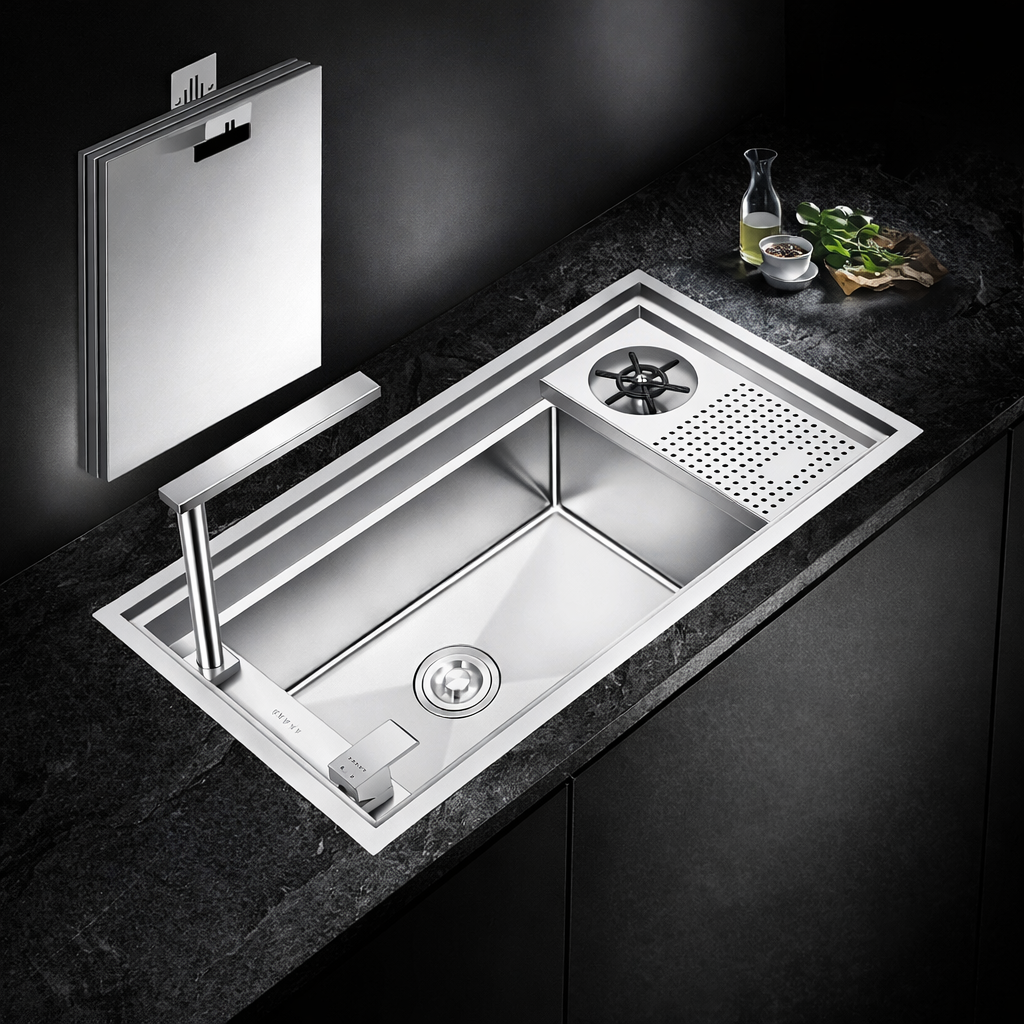 Bacha de una fosa en acero inoxidable 304, medidas 83 x 43 x 22, espesor de acero 1,22 mm. Con griferia oculta, sistema limpiador de vasos y tres tapas en inox para ocultar el lavaplatos. Contiene sistema de reduccion de vibracion y sonido. Incluye sopapa y sifon. Marca Zhen industria China clase A.
