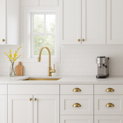 Jalador tipo concha en laton macizo, acabado oro cepillado. Marca Helios, industria americana.