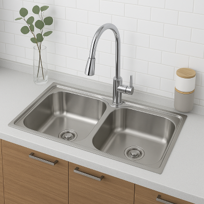 Bacha de cocina de doble fosa en acero inoxidable 201 sin escurridero, grosor 0.6 mm. Medidas 78 x 43 x 16.5 cm, acabado satinado mate. Marca Zhen, industria china clase A.