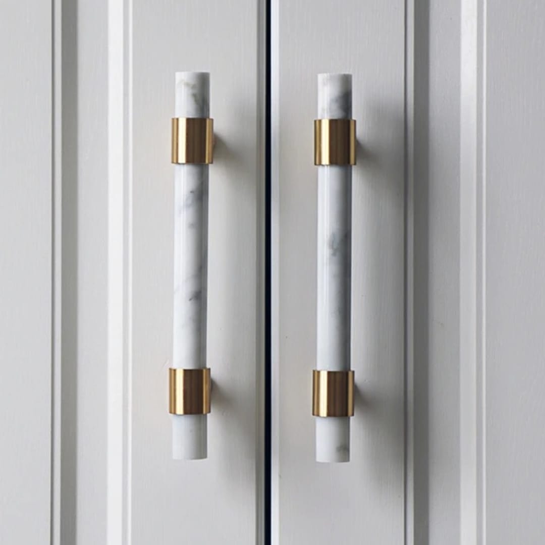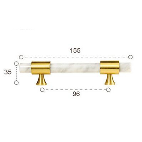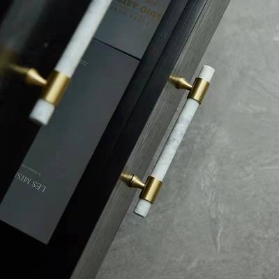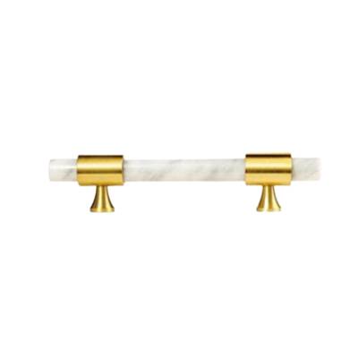 Jalabor barral para muebles, en marmol carrara blanco y bases de bronce, con acabado en bronce pulido. Medida 15.5 cm de largo. Marca Zhen, industria china clase A.