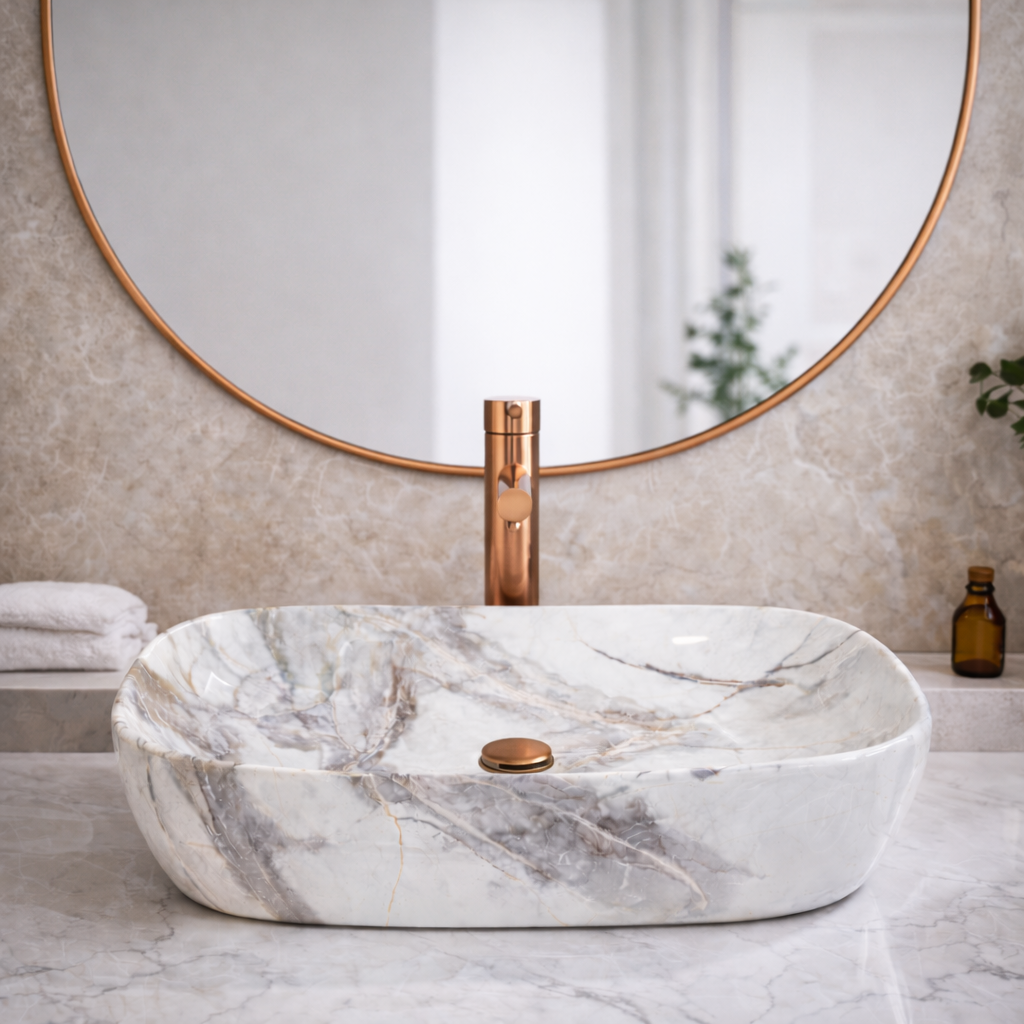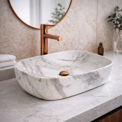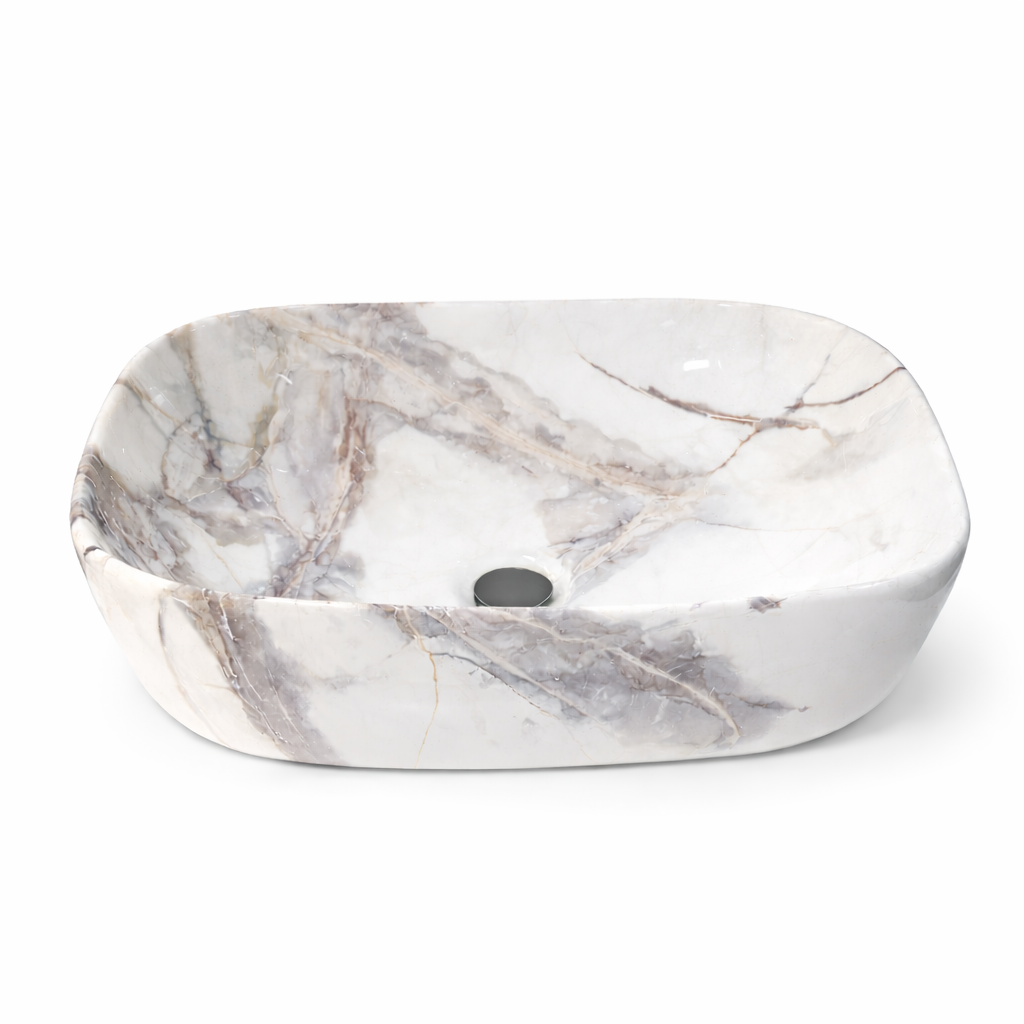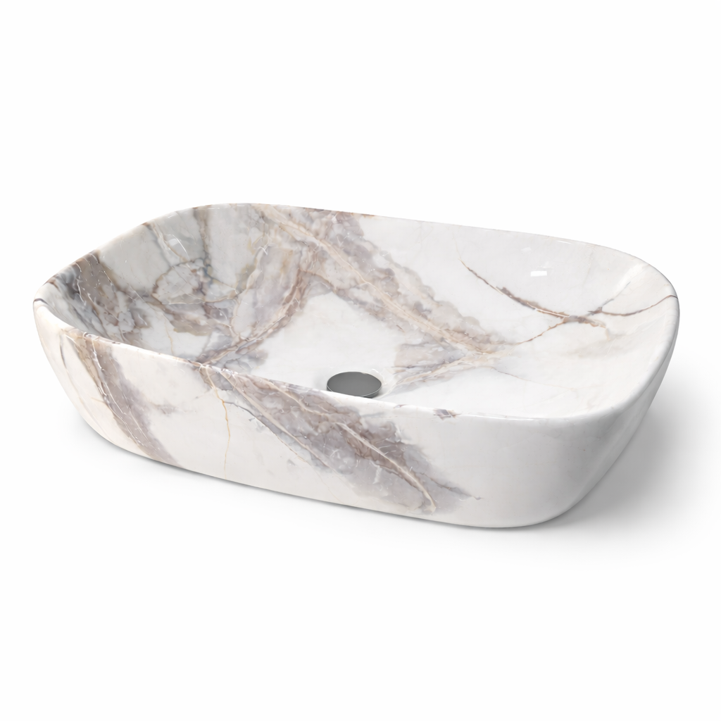 Lavamanos de sobreponer tipo mármol, modelo Razzoli. Acabado brillo, carrara blanco con jaspes dorados y marrones. Medidas: 46 x 34 x 13.5 cm. Marca Verona, diseño italiano.