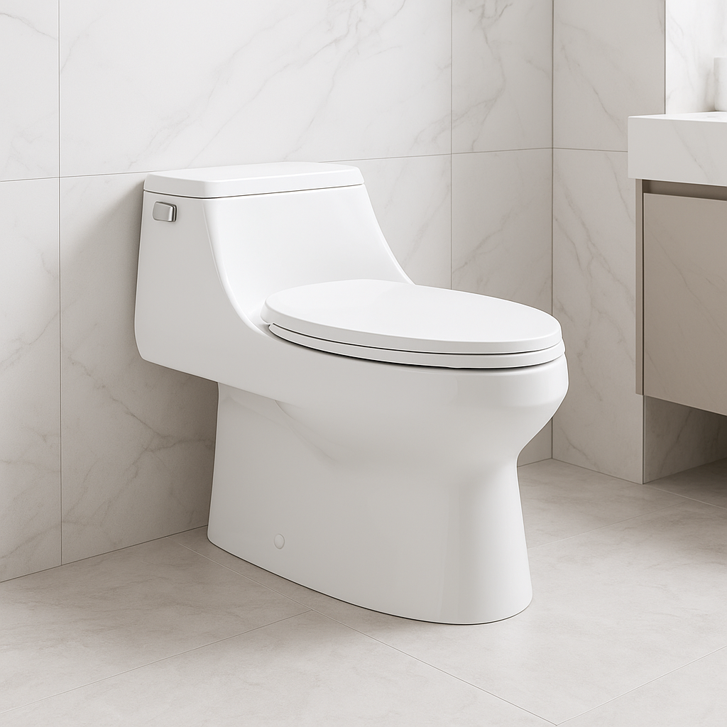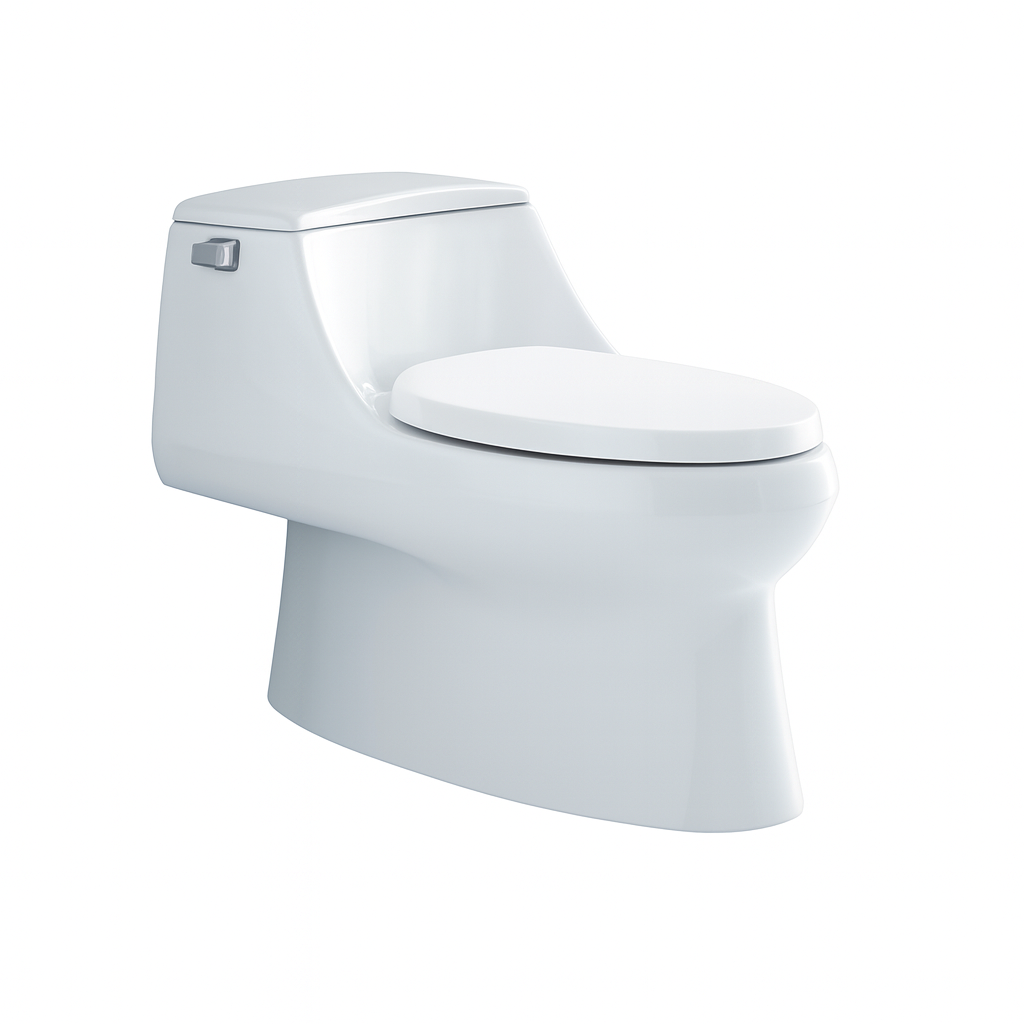 Inodoro de una pieza elongado blanco brillo, con diseño de tanque bajo, descarga simple a palanca, acabado cromado. Marca Verona, diseño italiano.