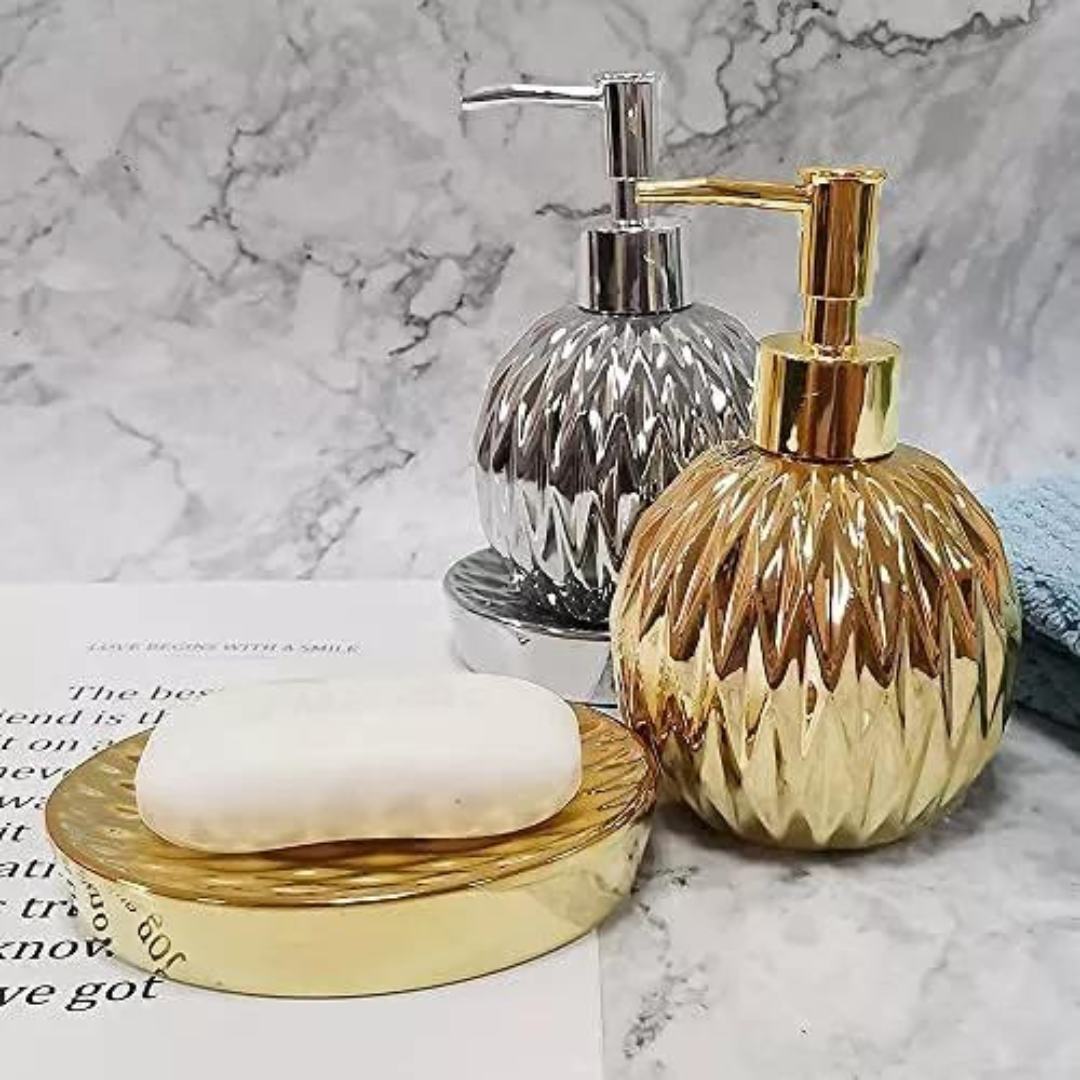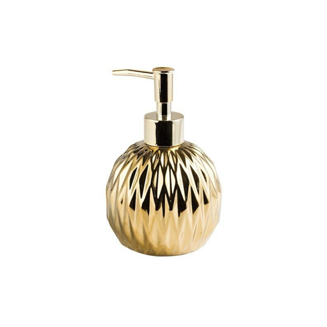 Dispensador de jabón de porcelana con capacidad de 400 ml, acabado dorado. Medidas: 15.5 cm de alto x 8.4 cm de ancho .Marca Zhen, industria china, clase A.