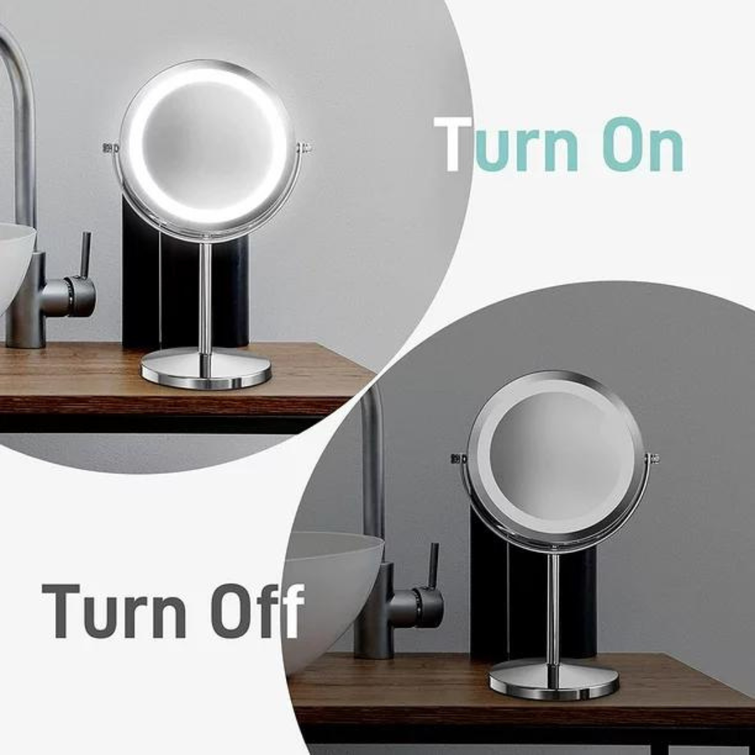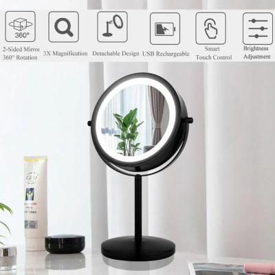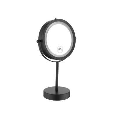 Espejo de mesada doble cara con aumento 3X, y luz led incorporada. Terminación negro mate. Marca Zhen, industria china clase A.