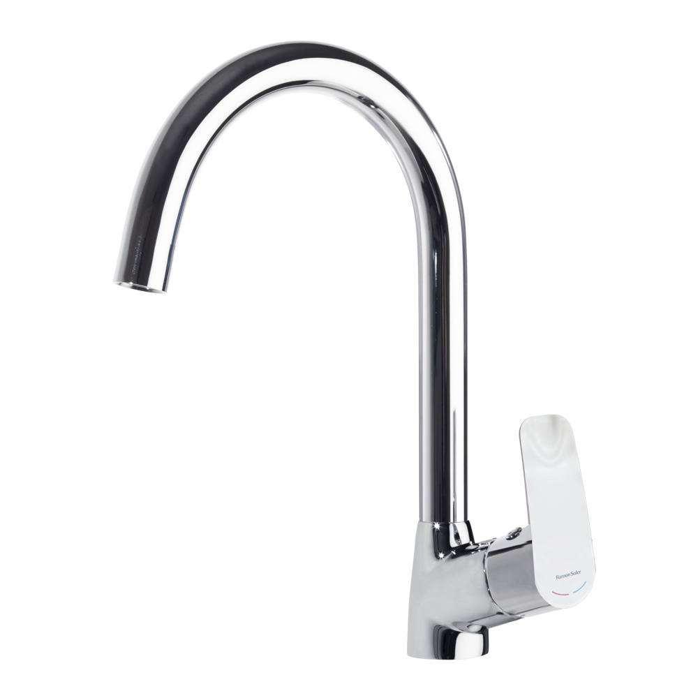 Monomando fregadero vertical cónico con con caño cisne, incluye los sistemas Tool Free patentado para una fijación rápida y segura, Termostop Block de limitación de la temperatura máxima del agua caliente y con Sistema de ahorro de agua (S2-C2) mediante la apertura de la manecilla en dos fases. Ánodo de sacrificio anticorrosión de zinc-magnesio. Acabado cromado de alta resistencia Diamond Finish. Marca Ramon Soler, industria española.